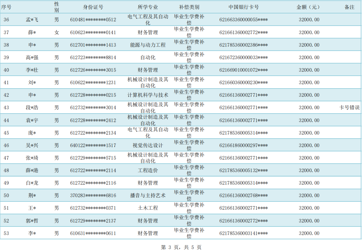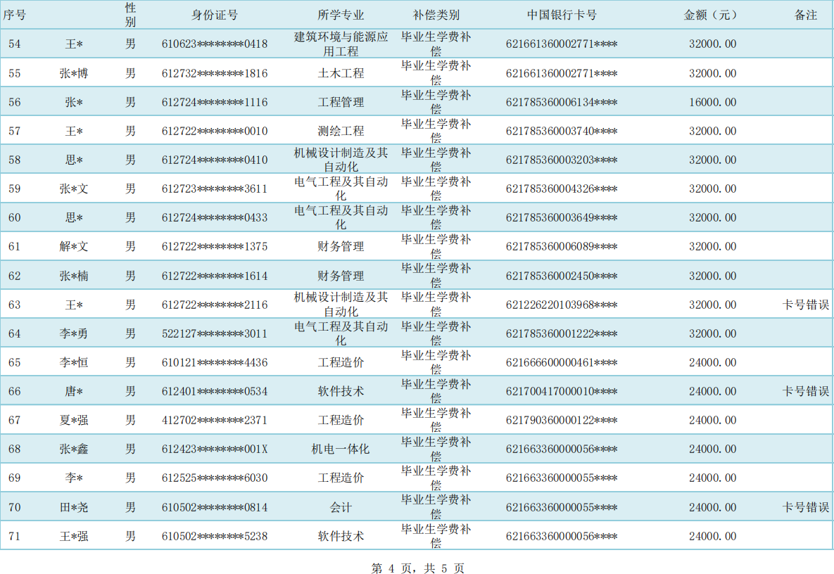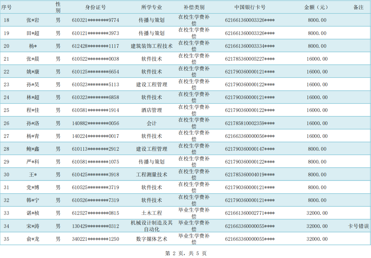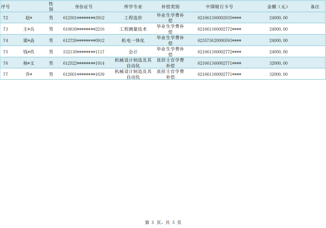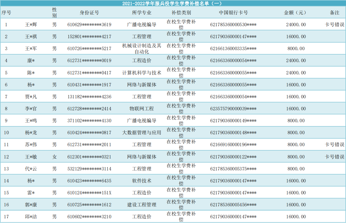 2021-2022學年服兵役學生學費補償名單,如有未收到款項學生,請及時聯(lián)系學生處征兵工作站。