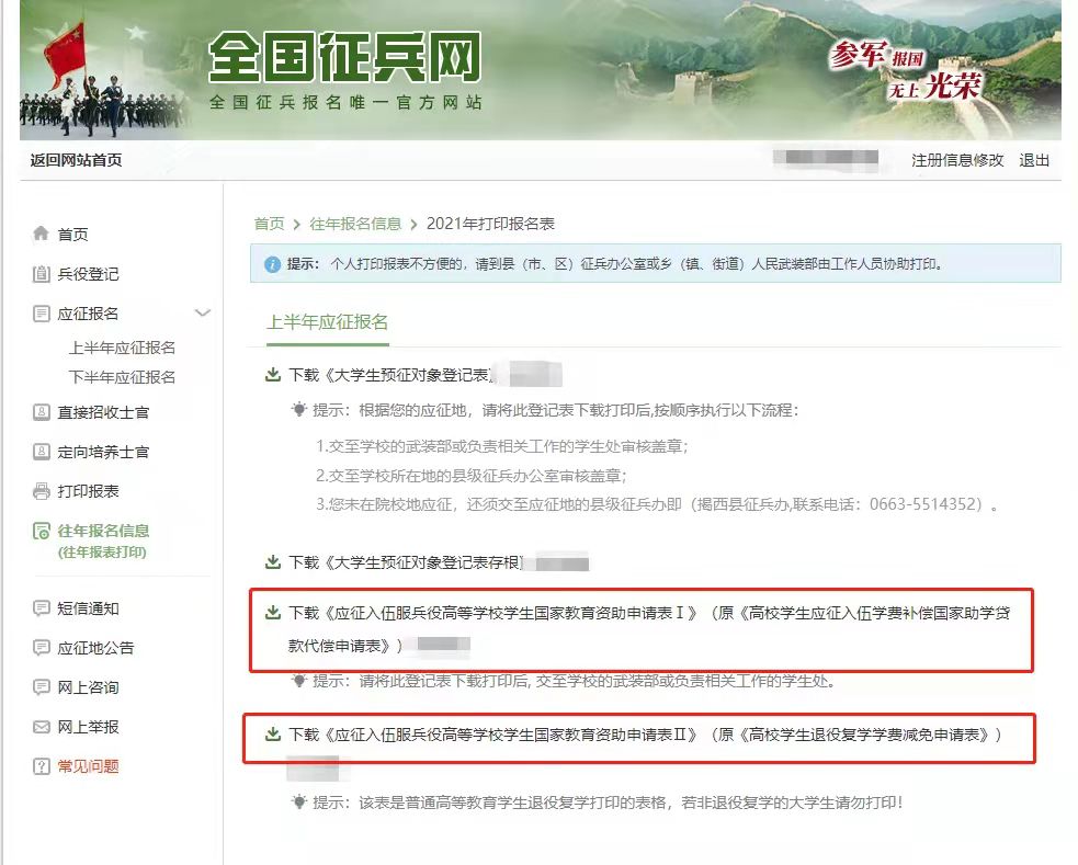 (3)應征入伍服兵役高等學校學生國家教育資助申請表Ⅱ(一式兩份,退役安置地退役軍人事務部門審核蓋章)。