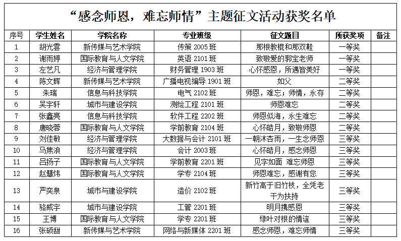 ? ? ? ? 根據(jù)陜西省教育廳辦公室下發(fā)《關(guān)于做好2022年教師節(jié)慶?;顒?dòng)的通知》文件精神,在教師節(jié)來臨之際,為了體現(xiàn)我學(xué)院學(xué)生對于教師的感恩之情。由學(xué)生處學(xué)生資助管理中心組織全院學(xué)生開展了“感念師恩,難忘師情”主題征文活動(dòng)。全院學(xué)生積極投稿,共計(jì)收到稿件400余件,經(jīng)過二級學(xué)院初評,學(xué)院評閱委員會(huì)審閱,最終,胡光雲(yún)等3名同學(xué)榮獲一等獎(jiǎng),陳文輝等5名同學(xué)榮獲二等獎(jiǎng),劉佳敏等8名同學(xué)榮獲三等獎(jiǎng),具體獲獎(jiǎng)名單公示如下: