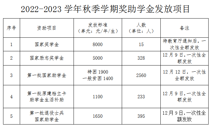 ? ? ? ?為了保障每一位同學(xué)順利完成學(xué)業(yè),尤其是確保家庭經(jīng)濟(jì)困難學(xué)生無憂就學(xué),促進(jìn)學(xué)生的全面發(fā)展,國家和學(xué)校設(shè)立了多種獎(jiǎng)助學(xué)金。2022-2023學(xué)年我校系列獎(jiǎng)助學(xué)金已順利完成評選、上報(bào)、審核等工作。近日,各項(xiàng)獎(jiǎng)助學(xué)金陸續(xù)發(fā)放,具體發(fā)放項(xiàng)目如下: