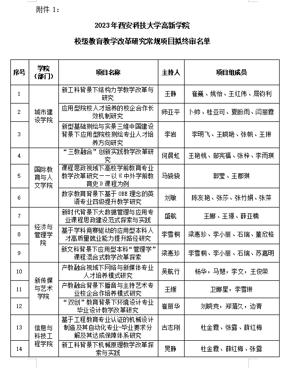 附件1:2023年西安科技大學高新學院校級教育教學改革研究常規(guī)項目擬終審名單