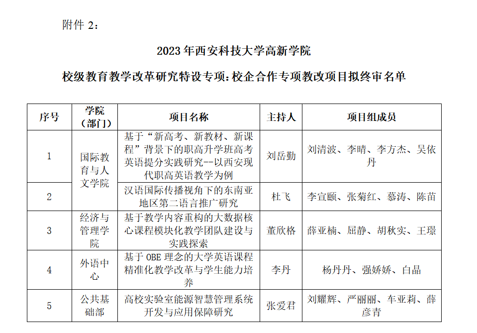 附件2:2023年西安科技大學高新學院校級教育教學改革研究特設專項:校企合作專項教改項目擬終審名單