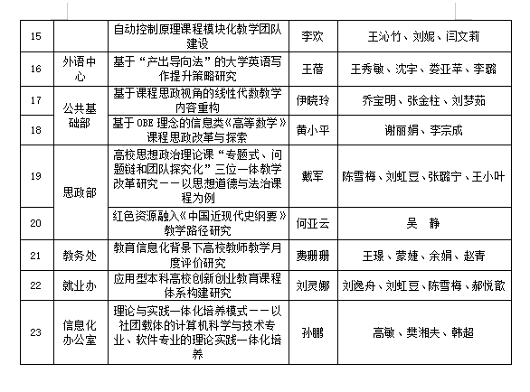 依據學院下發(fā)的《西安科技大學高新學院關于開展2023年校級教學改革研究項目申報工作的通知》(西科高新教發(fā)[2023]2號)要求,學院教學指導委員會對此次上報的49個項目進行了初審。秉承公平、公正、公開的原則,經過最終評議,確定23個校級教改項目及11個特設專項通過初審,進入終審答辯。現將擬通過的校級教改常規(guī)項目及特設專項(見附件)予以公示。自公示之日起3日內,任何單位或個人對評議結果有異議,可以書面或口頭形式向教務處實名反映。