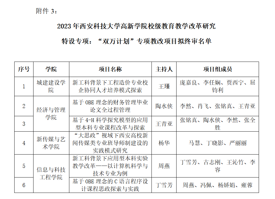 附件3:2023年西安科技大學高新學院校級教育教學改革研究特設專項:“雙萬計劃”專項教改項目擬終審名單