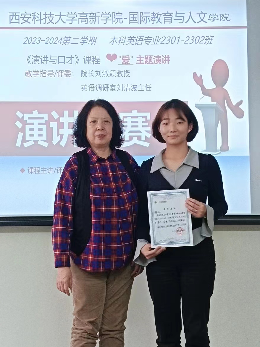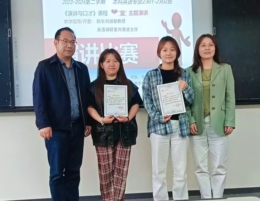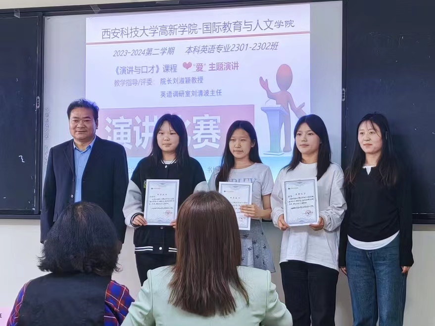 為培養(yǎng)高素質(zhì)應(yīng)用型人才,貫徹西安科技大學(xué)高新學(xué)院實戰(zhàn)型教育理念,4月16日,國際教育與人文學(xué)院英語教研室舉辦了英語專業(yè)演講比賽,國際教育與人文學(xué)院教學(xué)院長劉淑穎教授、英語教研室主任劉清波老師、副主任陳友艷老師、《演講與口才》課程主講王印堂老師擔(dān)任此次比賽評委,并為獲獎學(xué)生頒獎。本次活動由王印堂老師策劃組織。英語本科專業(yè)2301班和2302班的學(xué)生參加了此次比賽。