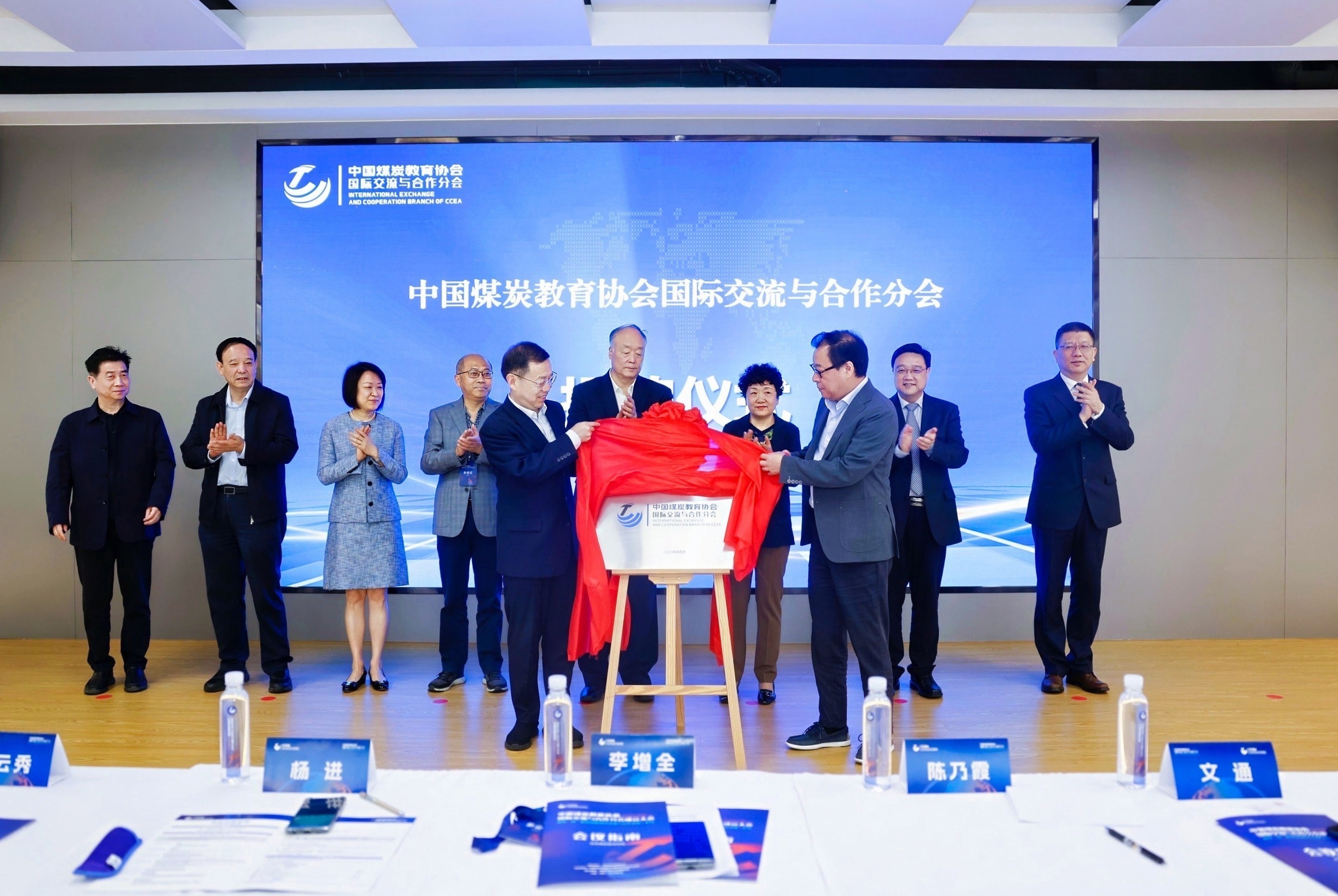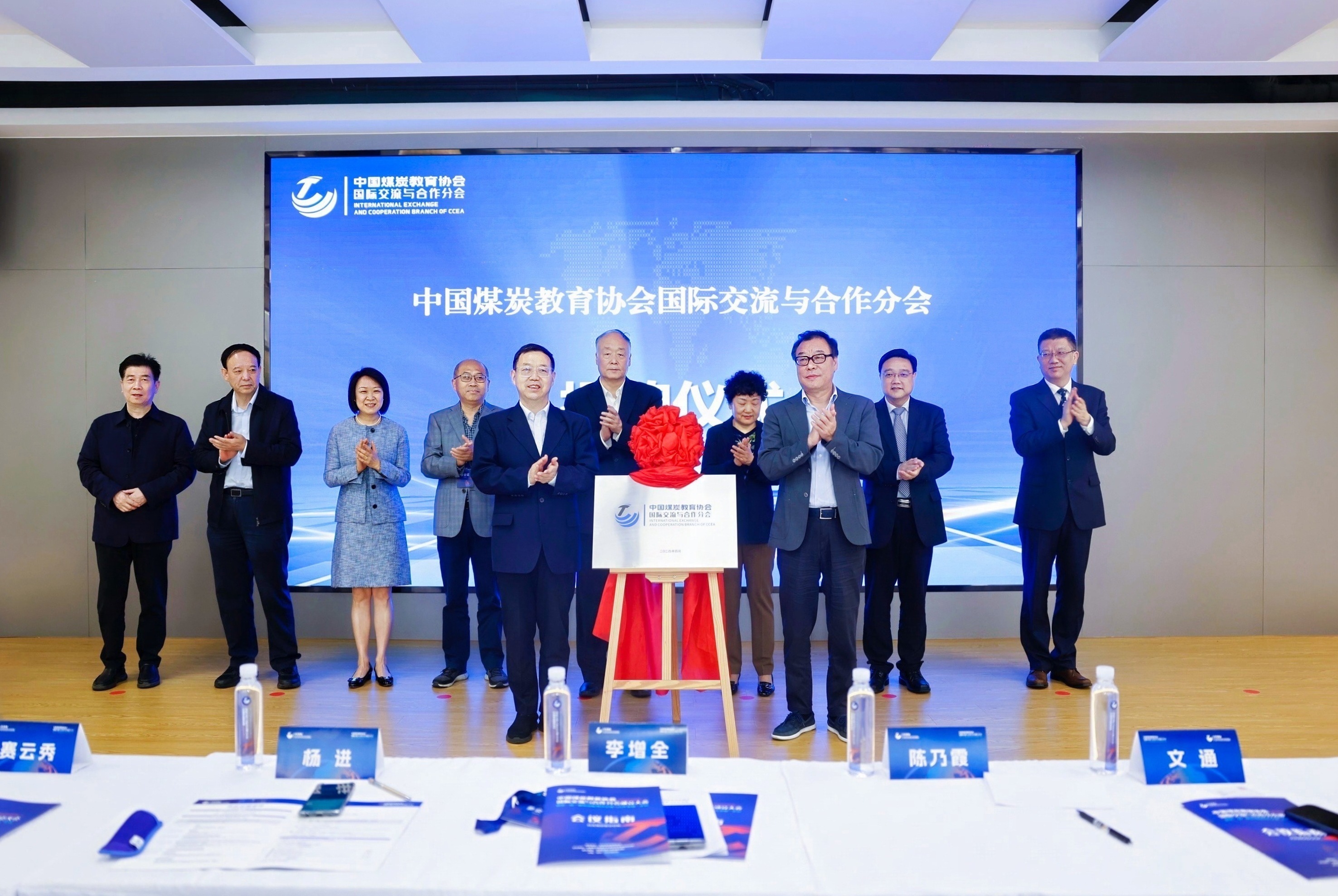 中國煤炭教育協(xié)會理事長李增全和西安科技大學高新學院董事長孫龍杰在陳乃霞、楊進、文通、王慧凌、袁國華、賽云秀、劉予東、鄭學平等嘉賓的共同見證下為中國煤炭教育協(xié)會國際交流與合作分會揭牌。