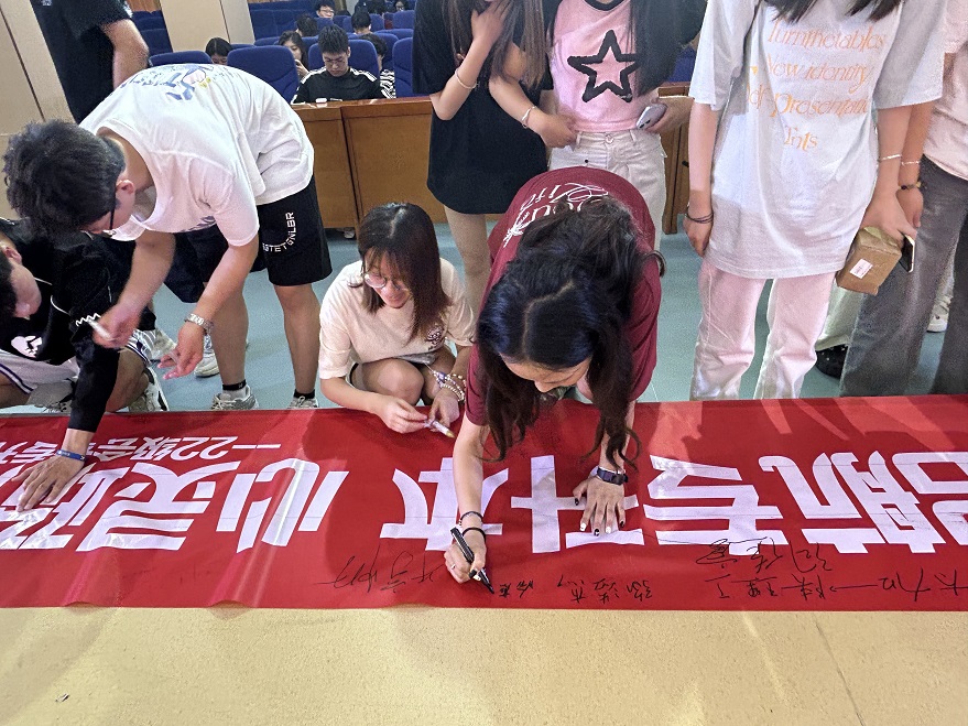 活動最后階段現(xiàn)場為同學(xué)們設(shè)置了兩個特別的環(huán)節(jié)。每位同學(xué)寫下自己的目標院校及期許并投入夢想箱中。這個環(huán)節(jié)讓同學(xué)們更加明確了自己的目標和方向。隨后,同學(xué)們紛紛拿起筆,在活動橫幅上簽下自己的名字,表達了自己對專升本考試的決心和信心。