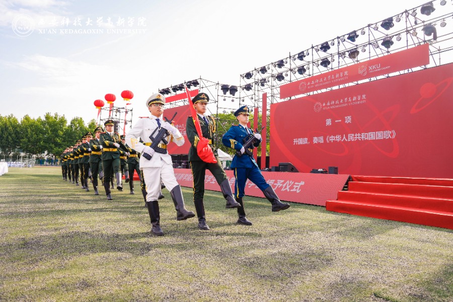 畢業(yè)典禮在升國(guó)旗、奏國(guó)歌中拉開(kāi)帷幕。國(guó)旗護(hù)衛(wèi)隊(duì)手持五星紅旗,雄壯激昂的國(guó)歌響起,五星紅旗冉冉升起,全體師生向國(guó)旗行注目禮。