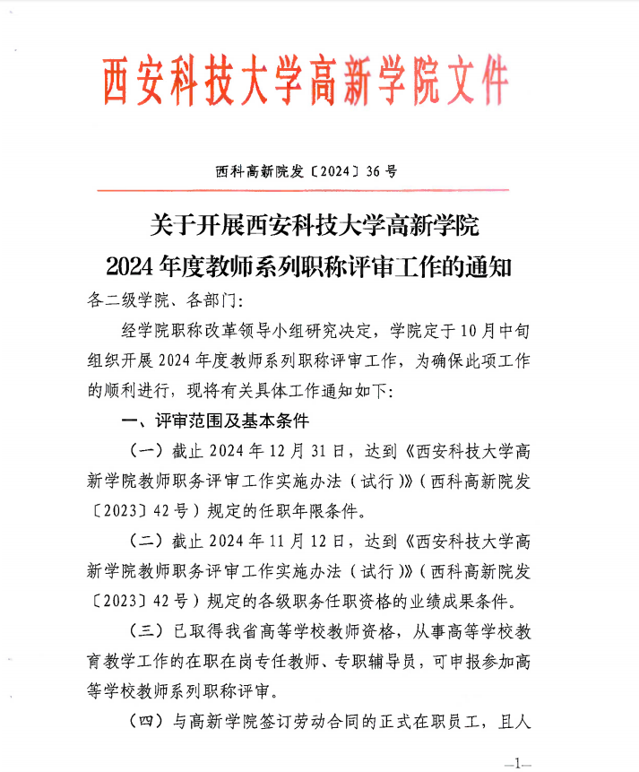 關(guān)于開展西安科技大學(xué)高新學(xué)院2024年度教師系列職稱評(píng)審工作的通知