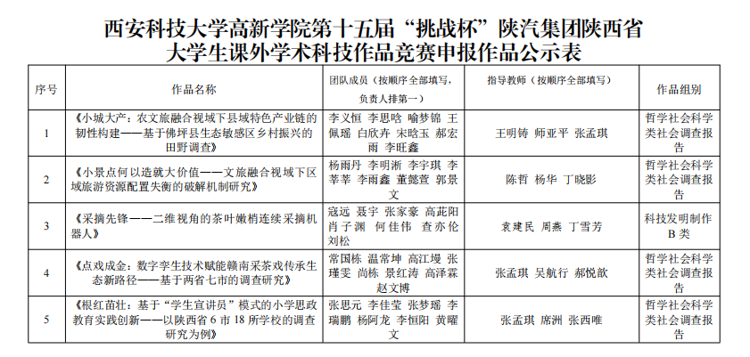西安科技大學(xué)高新學(xué)院第十五屆“挑戰(zhàn)杯”陜汽集團(tuán)陜西省大學(xué)生課外學(xué)術(shù)科技作品競(jìng)賽申報(bào)作品公示表