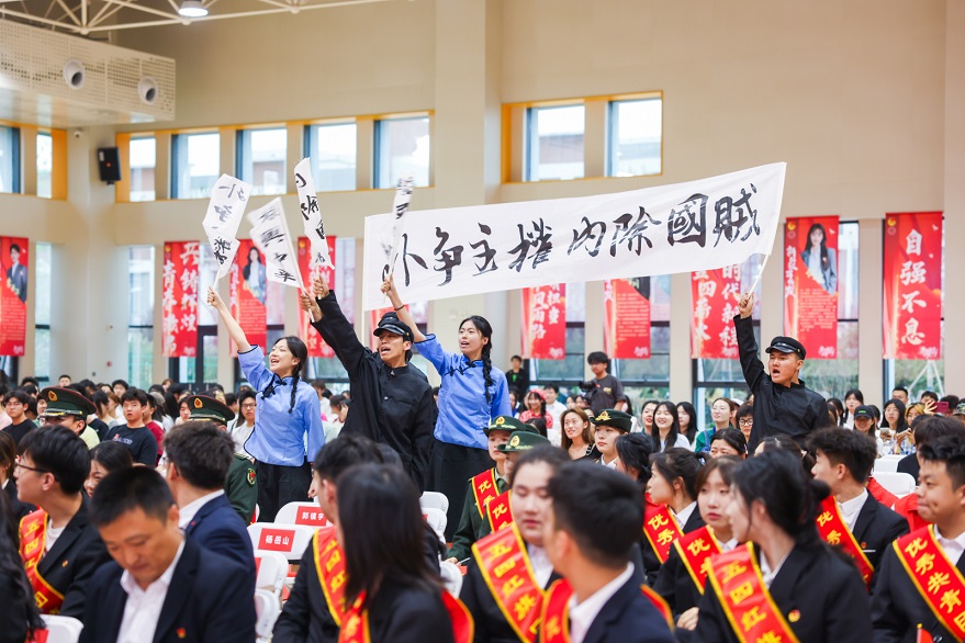 開場節(jié)目《青春百年?薪火相傳》由國旗班、聲樂社及各二級學(xué)院共同演繹,以話劇表演沉浸式呈現(xiàn)百年青年奮斗史。五組演員分飾 1919 抗爭、1949 建國、1979 改革、1999 榮光、2025 強國等年代青年,在觀眾席間快節(jié)奏還原歷史經(jīng)典場景,現(xiàn)場觀眾反響熱烈,掌聲不斷。